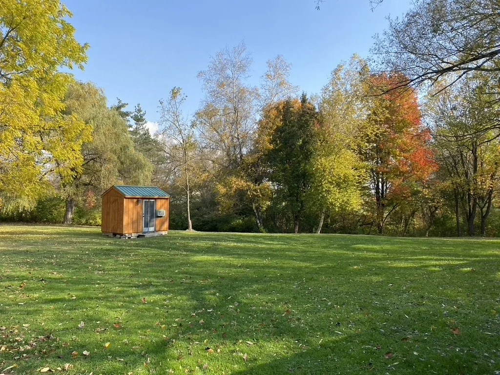 The pump house contains the well head, pump, and pressure tank, which are hidden under a counter; a full bed bunked over a full futon; and a TV, DVD, NES Classic, and SNES Classic. It has heating and AC.
